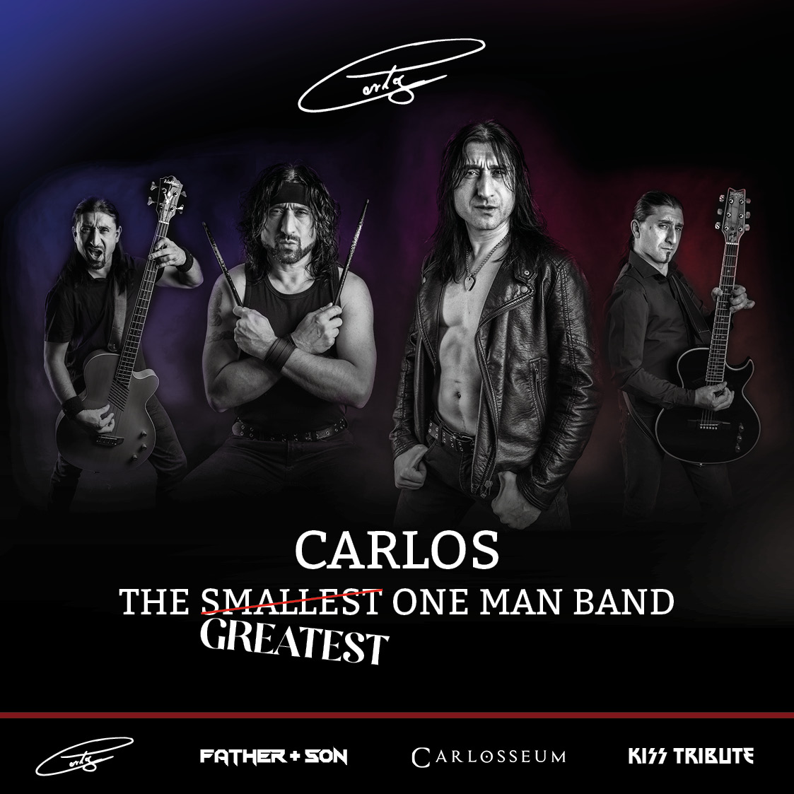 Mittlerweile ist er mit 4 unterschiedlichen Musikprojekten erfolgreich: Sowohl als Solist CARLOS mit seinem Akustik-Programm als auch mit dem Rock-Duo FATHER + SON, gemeinsam mit seinem Sohn Sabino, und als Gene Simmons in KISSTribute Bands wie „KISSIN‘ TIME“.